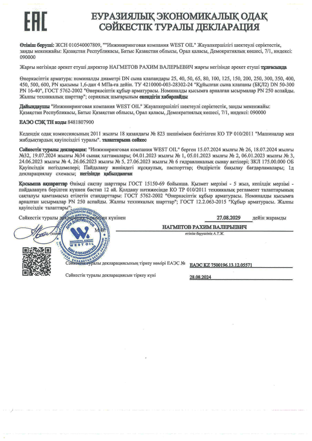 Декларация о соответствии № ЕАЭС KZ 7500196.13.12.05571